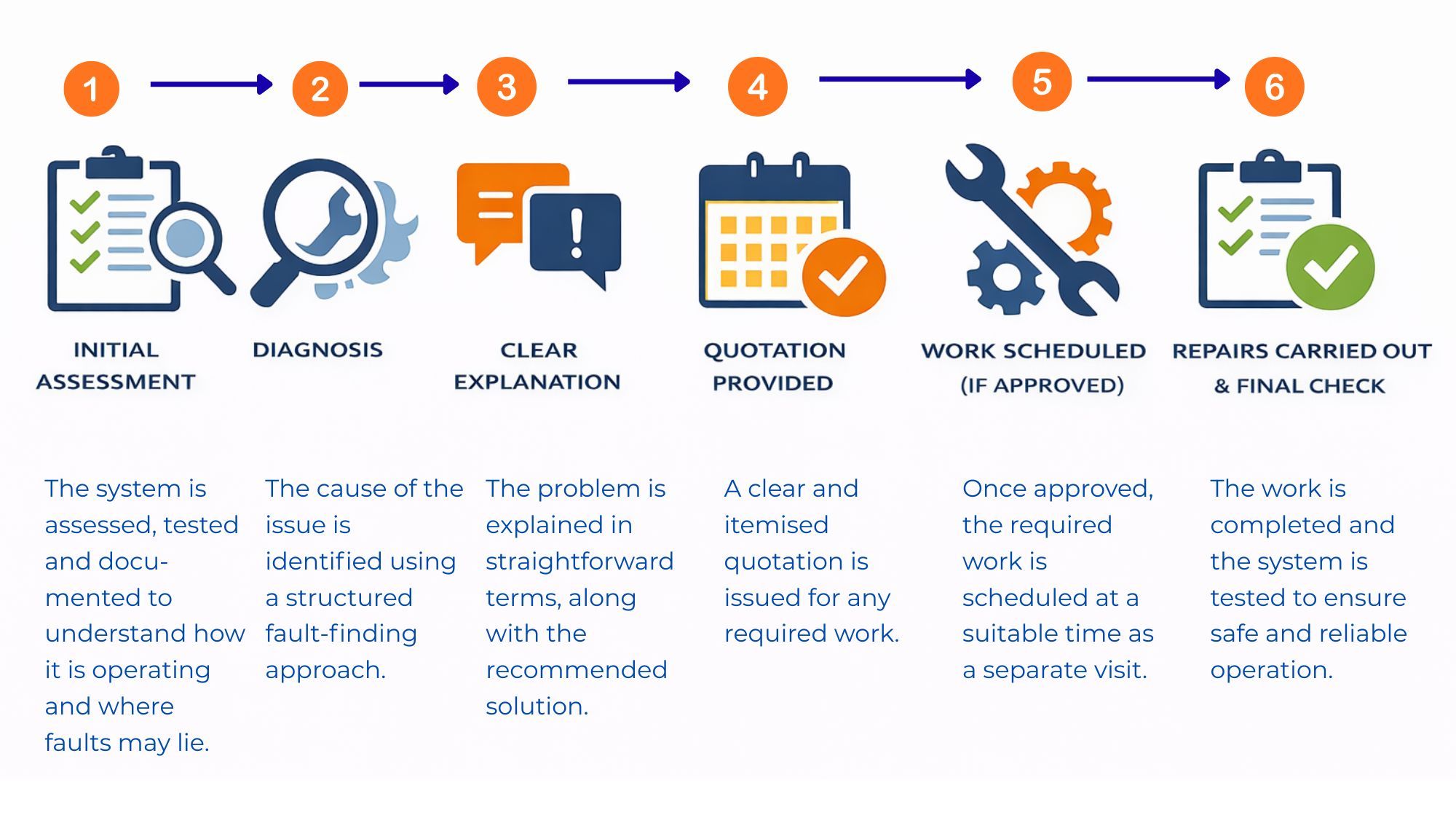 Repair work is carried out as a separate, scheduled visit following inspection and approval. Where replacement parts are required, these will be identified during diagnosis and clearly quoted before any work is carried out.
